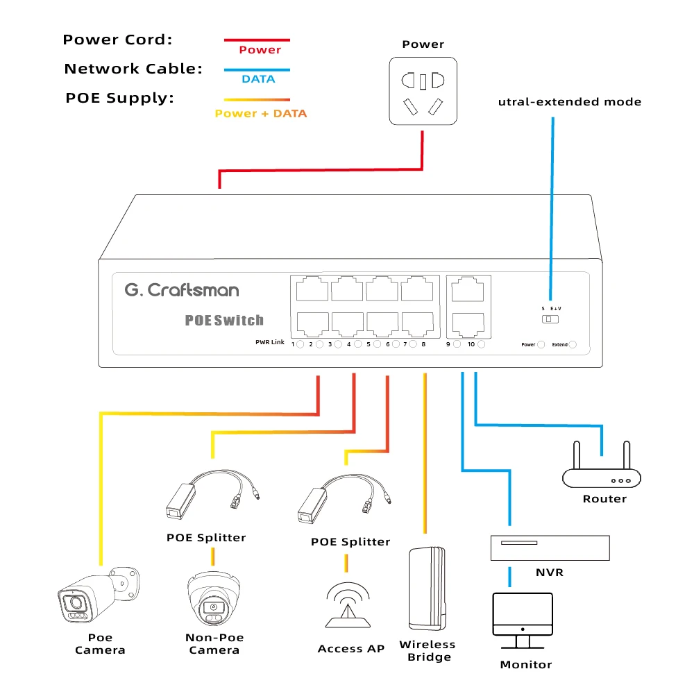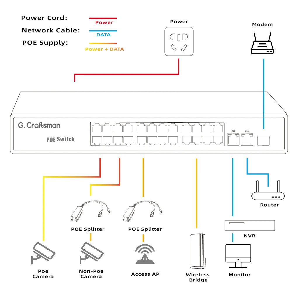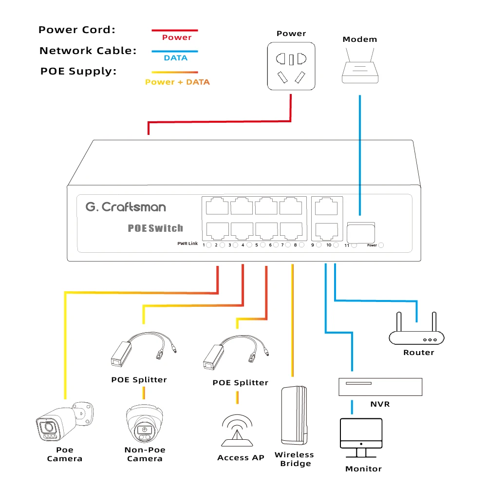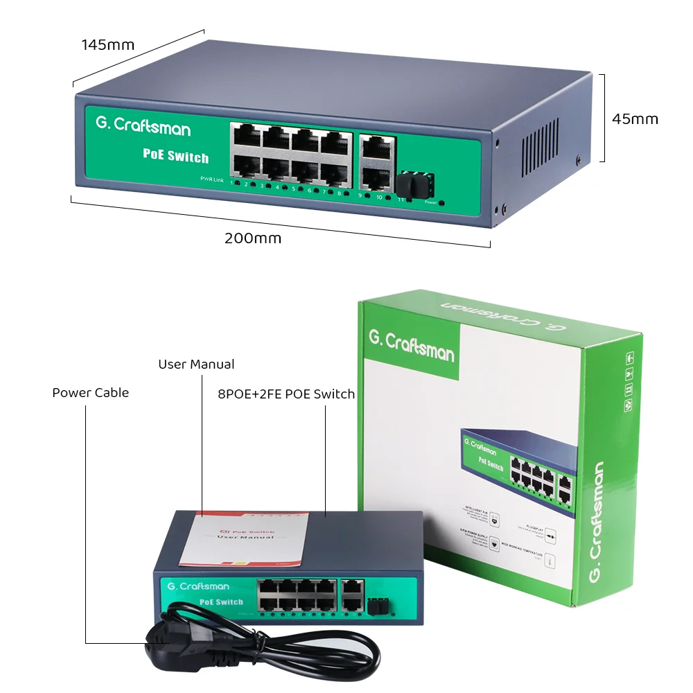 G.Craftsman-POE 스위치 4 8 16 포트 지원 IEEE802.3af/at CCTV 5MP 8MP 4K IP 카메라, 비디오 감시 무선 AP 100/1000bps
